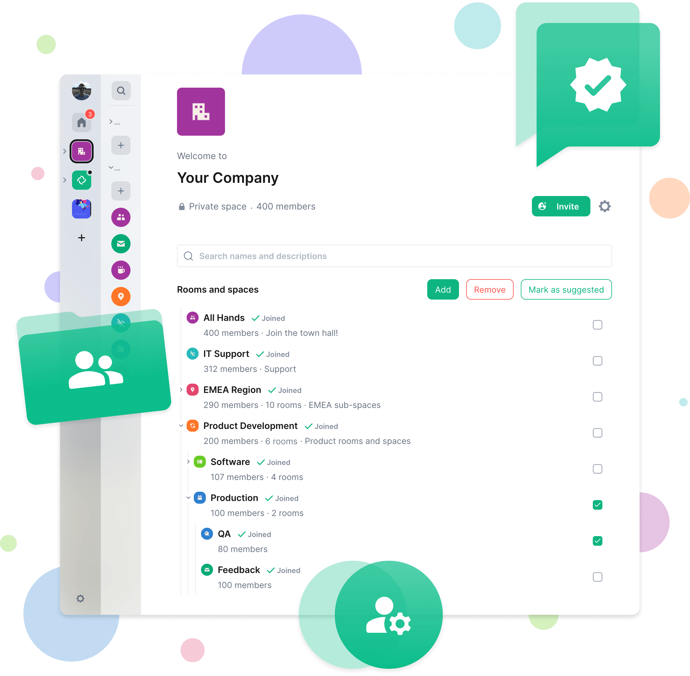 Spaces is Element’s Silver Bullet for Admins! It allows Admins to structure enterprise chat rooms for employees and teams in a logical hierarchy, similar to a shared folder system.